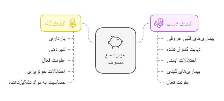 • تزریق چربی: بیماری‌های قلبی عروقی، دیابت کنترل نشده، اختلالات ایمنی، بیماری‌های کبدی، عفونت فعال.