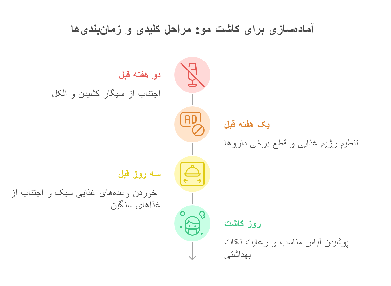 توصیه می‌شود که حداقل دو هفته قبل از عمل کاشت مو، مصرف الکل و سیگار به طور کامل قطع شود. این مواد می‌توانند تاثیر منفی بر جریان خون و روند بهبود زخم‌ها داشته باشند و در نتیجه، موفقیت عمل را تحت تاثیر قرار دهند.
