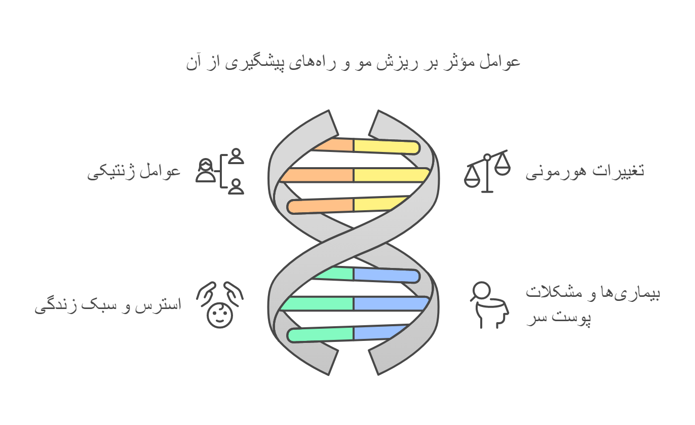 ریزش مو میتواند ناشی از عوامل مختلفی باشد که در ادامه به برخی از مهمترین آنها اشاره میکنیم: