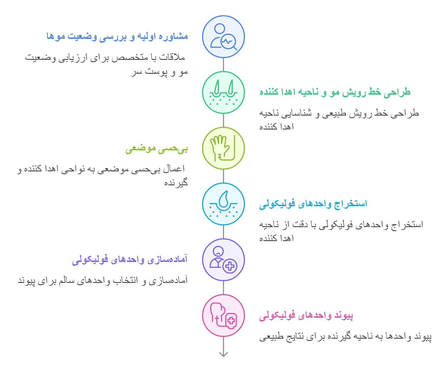 • پزشک با توجه به فرم صورت و سلیقه بیمار، خط رویش مو را طراحی می‌کند. این خط باید طبیعی و متناسب با چهره فرد باشد.