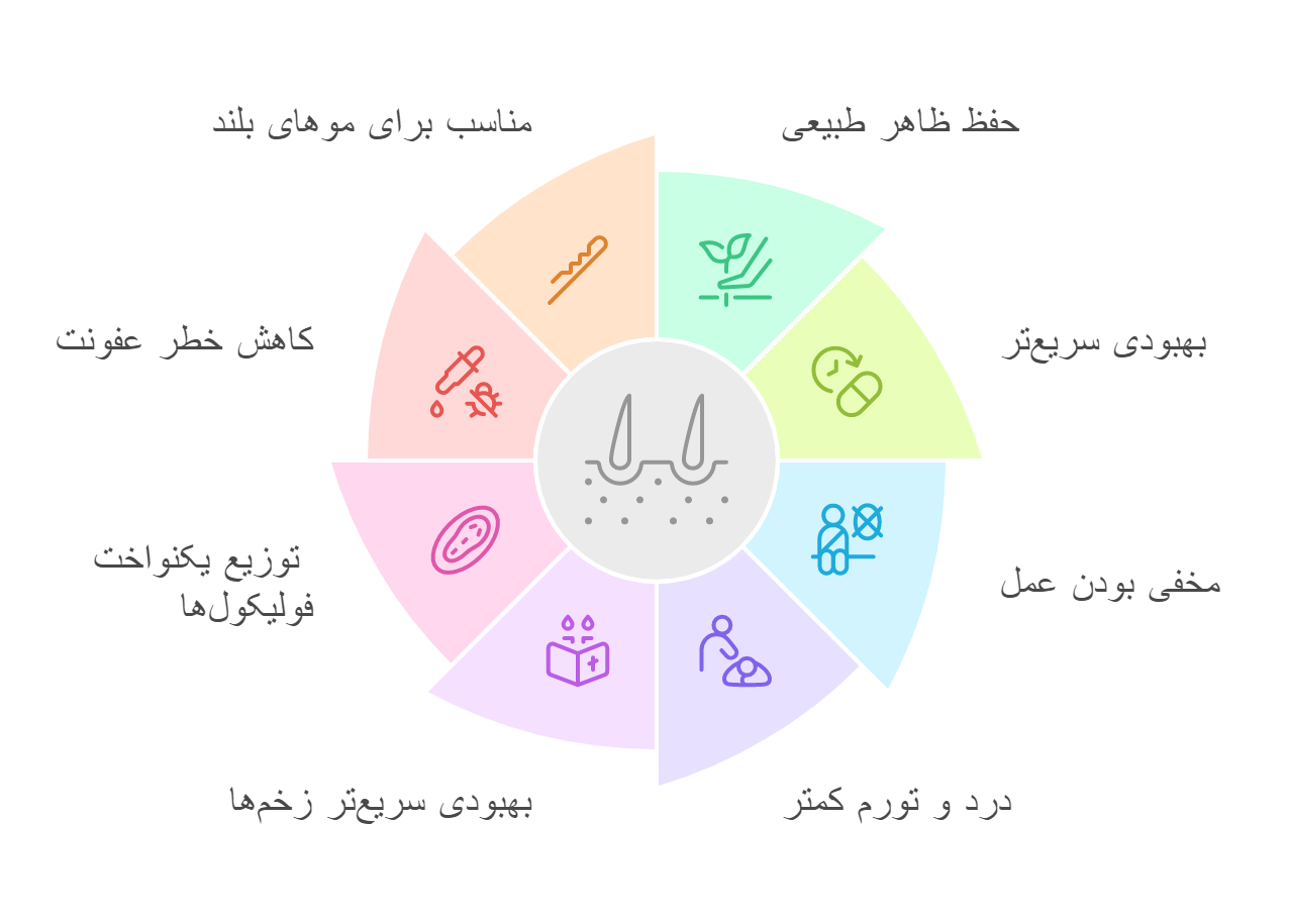 • حفظ ظاهر طبیعی موها در طول و بعد از عمل: این مزیت، به ویژه برای افرادی که به ظاهر خود اهمیت زیادی می‌دهند، بسیار مهم است.