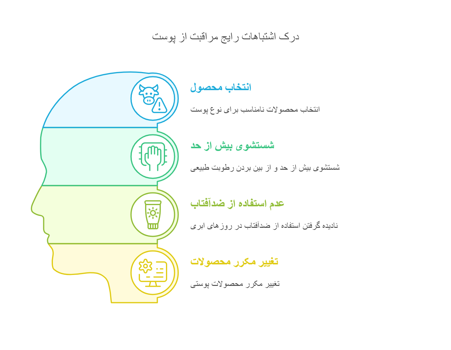 در کنار رعایت اصول صحیح مراقبت از پوست، آگاهی از اشتباهات رایج و پرهیز از آن‌ها نیز از اهمیت بسزایی برخوردار است. در این بخش به بررسی برخی از رایج‌ترین اشتباهات در مراقبت از پوست می‌پردازیم: